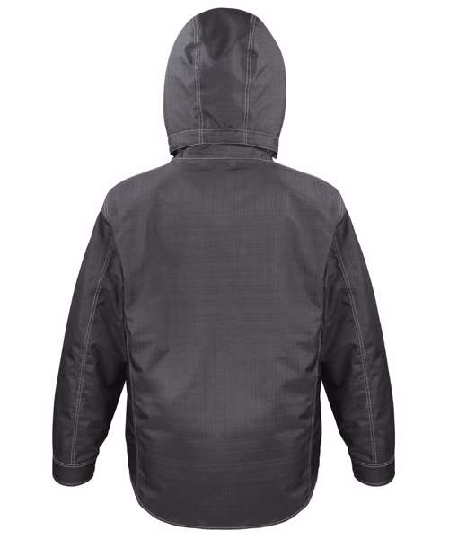 Tech: Waterproof 3000mm, Breathable 2000g, Windproof. Contrast twin needle stitching and bar tacks. Fashion shaped longer back panel. 4 outer and 2 inner zipped pockets. Quilted par-fleece lined. Stud closing storm flap. D-ring in LBP pocket. Tear release cuff. Removable hood. Taped seams. Reflective detail. Adjustable hem. Stand up collar. Hangtag. Rugged look. Hardwearing. Ready to brand – tag free. Corporate managers jacket styling.