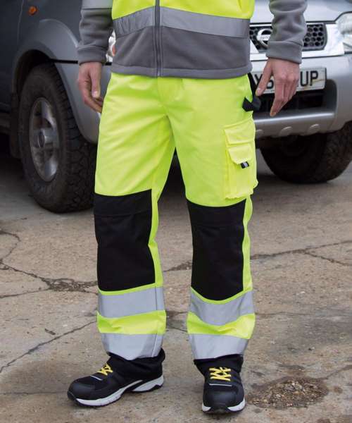 Functionality and high visibility performance are delivered without compromise in these tough and rugged safety cargo trousers. Multiple pockets, bar tacked stress points and hammer loop bring the performance whilst elasticated waistband, knee pad pockets and reflective leg bands bring the comfort and safety. Everything you expect and more from an EN20471 Class 2 safety trouser.