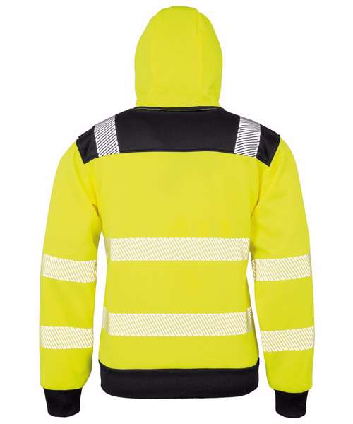 Hoody with heavy stretch rib cuffs and waistband. Easy-stretch, printed safety bands. Full front YKK zip and puller. Zipped front and chest pockets. Warm bushed fleece inner. Hood with drawcord. Hang loop. Recycled REPREVE® performance recycled fabric. EN ISO 20471: 2013 + A1:2016 Class 2 / Ris-3279-Tom Class 2 (orange only).