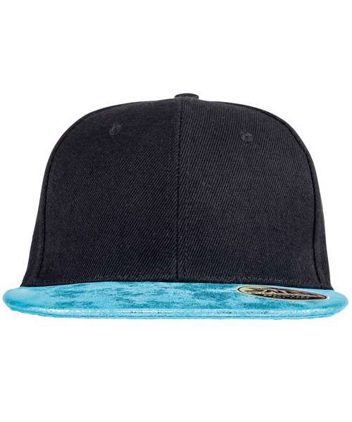 Recycled PU peak. Tear away label. CORE value product. 6 panel. Stitched eyelets. Stiffened front panels. Snapback adjuster. Contrast PU pearl fabric flat peak.