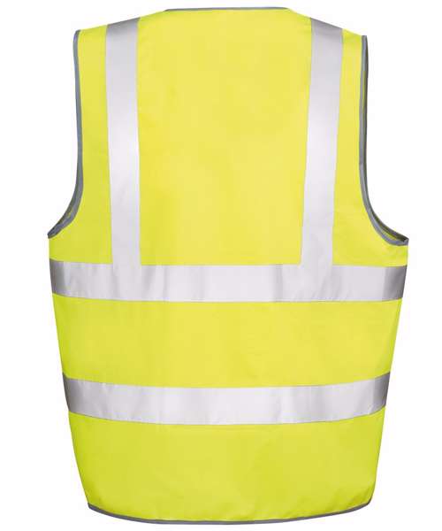 120g/m² 100% Polyester High visibility Class 2 safety vest with 2 bands of reflective tape around torso and one brace over each shoulder. Tear-release front fastening for easy access and grey polyester-bound edges. Generous in size, allowing to be worn as an overgarment. EN ISO 20471 + A1:2016 CLASS 2. RIS-3279-TOM ISSUE 2:2019 CLASS 2 (orange). Decorating methods: Embroidery, transfer, print.