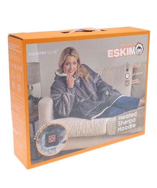 Eskimo oversized blanket hoodie with three adjustable heat settings. Super-soft microfleece with a large hood and pockets – one size fits most. Machine washable. Connects to most power banks via USB-A (power bank not included).
