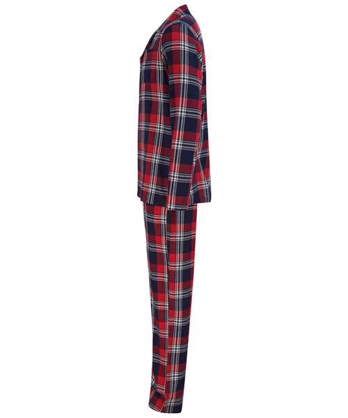 Woven tartan lounge set with plain hem. Shirt with a pyjama collar and pearlised button front, and bottoms with a full elasticated waist. Tear-out label.