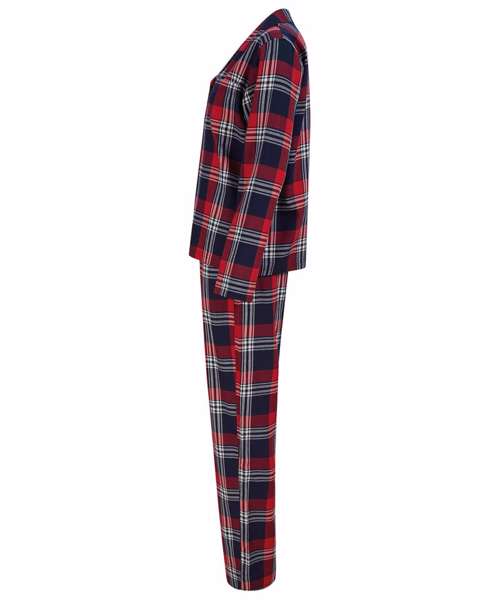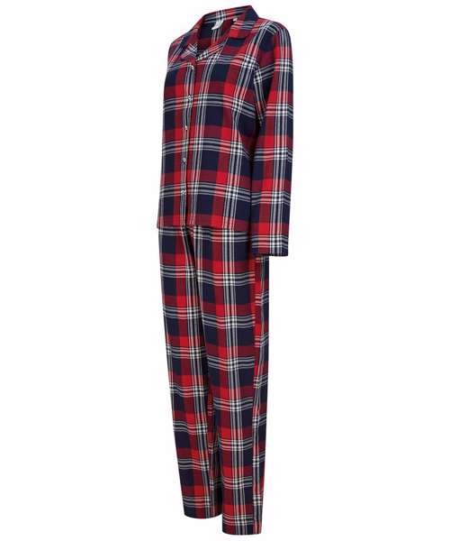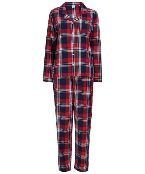 Woven tartan lounge set with plain hem. Shirt with a pyjama collar and pearlised button front, and bottoms with a full elasticated waist. Tear-out label.