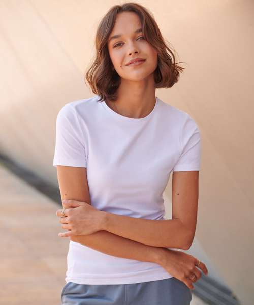 Feel good women's stretch t-shirt with enzyme wash for unique soft hand-feel. 96% cotton, 4% elastane for improved fit, comfort and shape retention. Modern long-line fit. Crew-neck with back neck binding and soft stretchy rib neckline. Features tear out label.