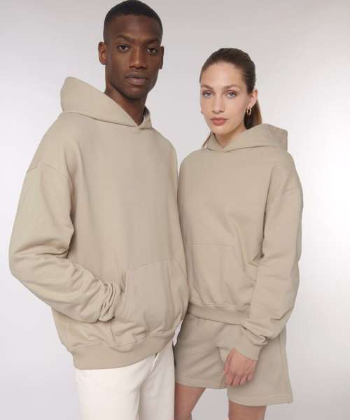 The unisex oversized boxy dry hand-feel hoodie sweatshirt with double-layered hood offers a relaxed feel with stylish details.