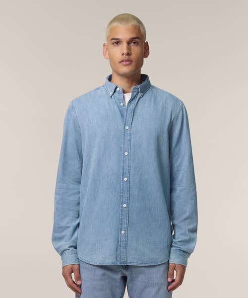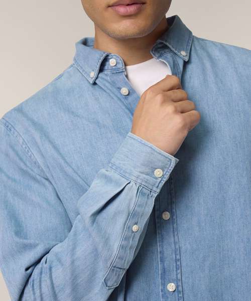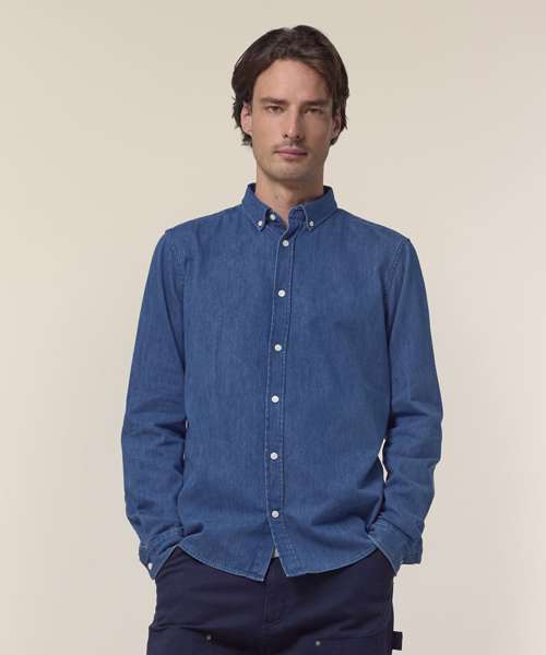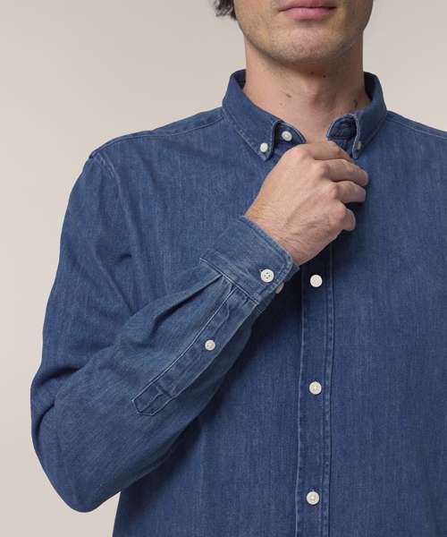 The Stanley denim shirt, for men, is a timeless wardrobe essential that can be layered over a t-shirt or tank top for a laid-back look, or worn alone. This medium-fit denim shirt features a button-down collar, reinforcing the relaxed look. Made from sturdy 235gsm indigo-dyed denim, it offers a durable, eco-friendly choice for anyone who prioritises sustainable men’s fashion. It’s been designed without a back pleat to maximise decoration possibilities, making it an excellent choice for customisation.