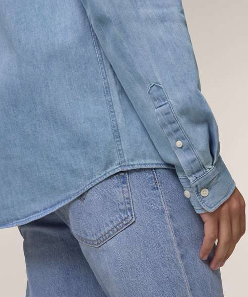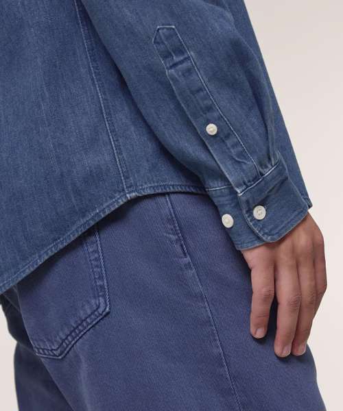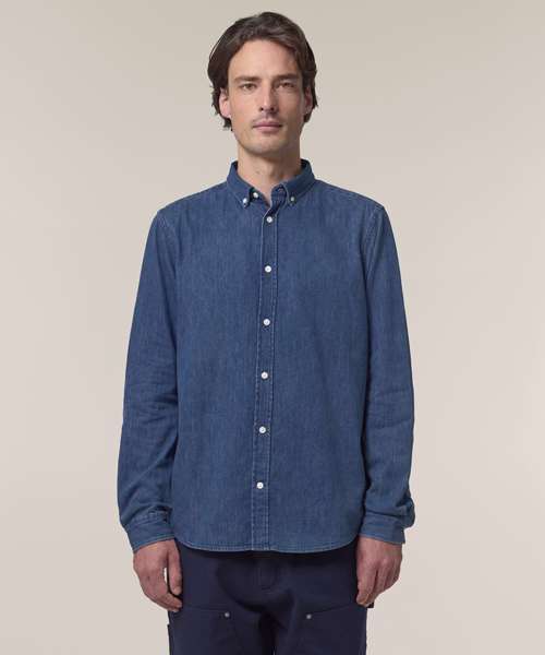 The Stanley denim shirt for men. Medium fit. Button-down collar with single-needle topstitches. Collar stand. Front placket single-needle topstitches on each side. Forwarded shoulder. Back yoke. Inside yoke in self-fabric. Set-in sleeves. Sleeve placket with one button. Cuff with two buttons. Rounded cuff corners. Double pleats at cuff seam. Faded look on all seams due to garment washing – indigo yarn dyed product – so each garment may vary in appearance.