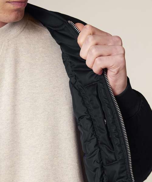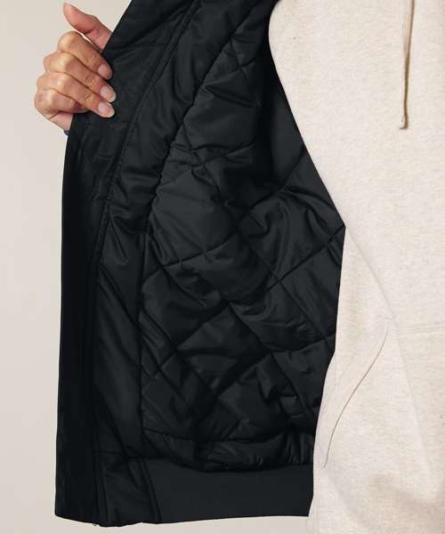 Silver metal zip at centre front. 1x1 rib at sleeve hem, bottom hem and collar. Zipped sleeve pocket with four pen slots. Welt pocket at front with snap closure. Inside fully quilted. Inside chest welt pocket with snap closure. Inside zip opening at bottom hem and wearer’s left and right chest for easy decoration.