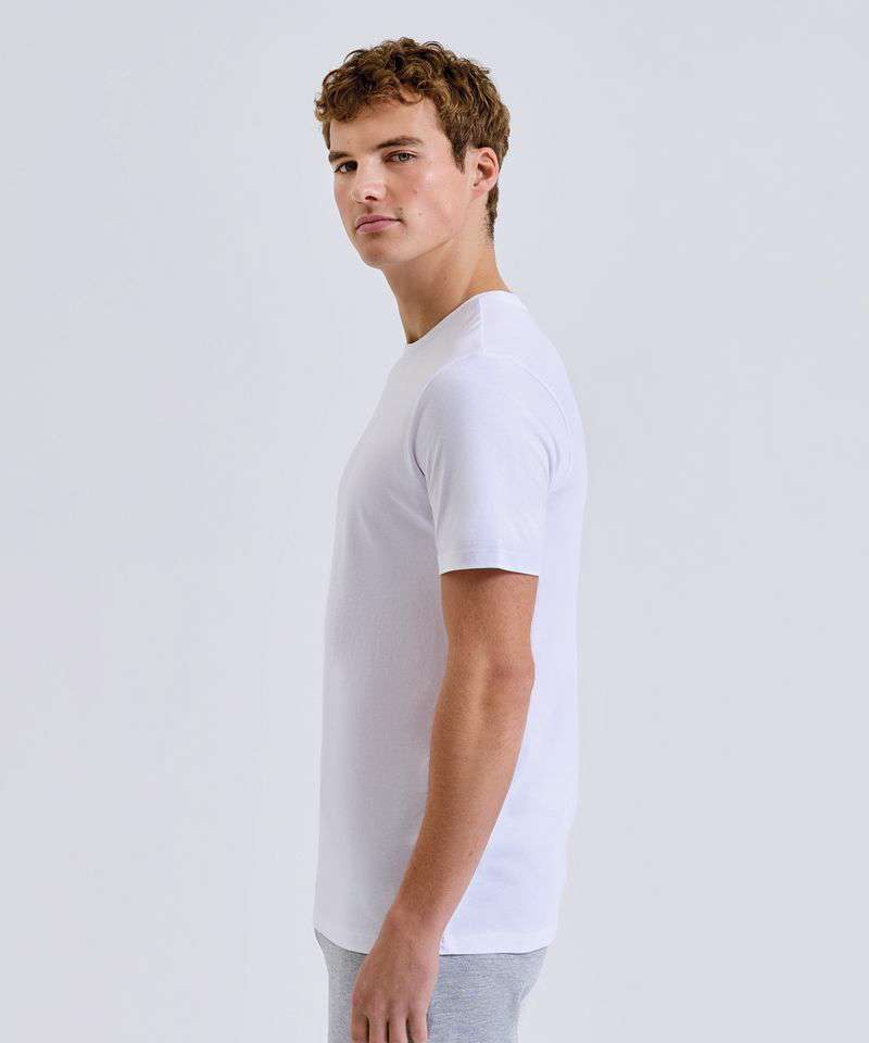 Organic cotton fabric. Crew neck. Short sleeve. Lightweight. Twin-needle stitching on hem and arms. The product contains no branded neck or waist label. Removable kimble or looped garment tags. The inner seam label holds important product information on one label with a second label containing brand information which can be cut-away.
