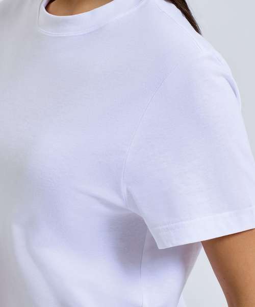 Organic cotton fabric crew neck. Short sleeve. Oversized fit. Twin-needle stitching on hem and arms. Drop shoulders. The product contains no branded neck or waist label. Removable kimble or looped garment tags. The inner seam label holds important product information on one label with a second label containing brand information which can be cut-away.