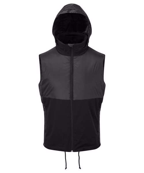 Hybrid gilet with padded panel upper chest and side seams. Lower jacket is shell fabric. Full zip-through style with collar. Drawcord inner hem. Zip side pockets. Concealed packable hood with adjustable cord and toggle to the back for to create a snug fit. Zip embroidery access to back panel and left chest. Inner pocket to left chest. Internal storm flap with zip guard. Packable bag included for handy storage of gilet when not in use. We recommend using block out vinyl and inks.Product contains no branded neck or waist label. Removable Kimble or looped garment tags. Inner seam label holds important product information on one label with a second label containing brand information which can be cut-away.