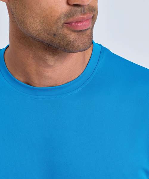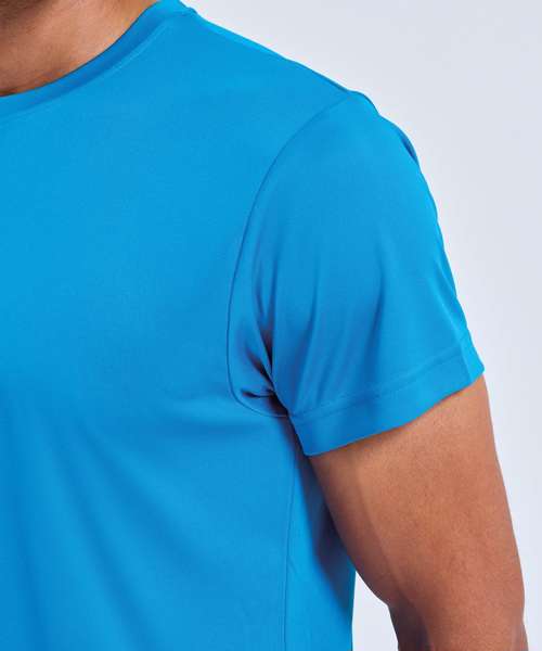 Wicking fabric. Stretch. Crew neck. Short sleeve. Lightweight. Twin-needle stitching on hem and arms. Recycled polyester. We recommend using block out vinyl and inks.Product contains no branded neck or waist label. Removable Kimble or looped garment tags. Inner seam label holds important product information on one label with a second label containing brand information which can be cut-away. UPF 40+.