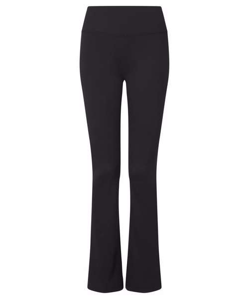 Full-length flared leggings. Soft-stretch fabric. Self-fabric waistband with hidden coin pocket. The product contains no branded neck or waist label. Removable kimble or looped garment tags. The inner seam label holds important product information on one label with a second label containing brand information which can be cut-away. We recommend using block out vinyl and inks.