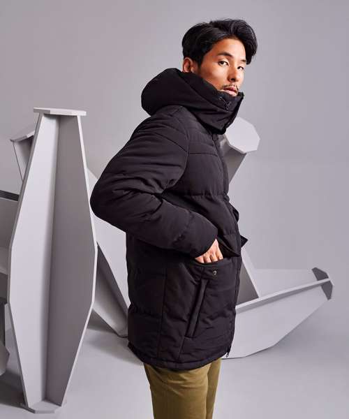 Warm, versatile, multi-baffled jacket. Centre front zip and storm flap, attached hood with additional popper fastenings. Warm polyfill quilted lining. Two zip front pockets and two pockets with popper fastenings. Inner adjusters and hood adjusters for a snug fit to lock in warmth. Inner phone pocket. Embroidery access. Product contains no branded neck label.* Removable Kimble or looped garment tags. Inner seam label holds important product information on one label with a second label containing brand information which can be cut-away.